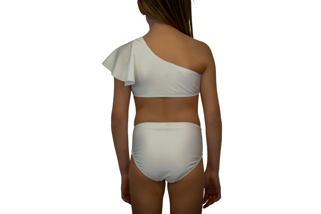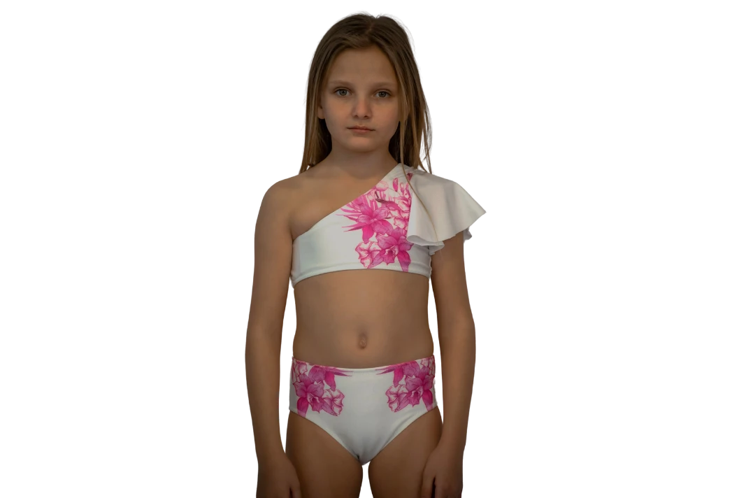 Σετ μπικίνι λευκό με τύπωμα φουξ floral και βολάν top, λευκό ψηλόμεσο bottom με τύπωμα φουξ floral. UPF 50+ αντιηλιακή προστασία, τα τυπώματα είναι αποκλειστικότητα της εταιρείας CL.