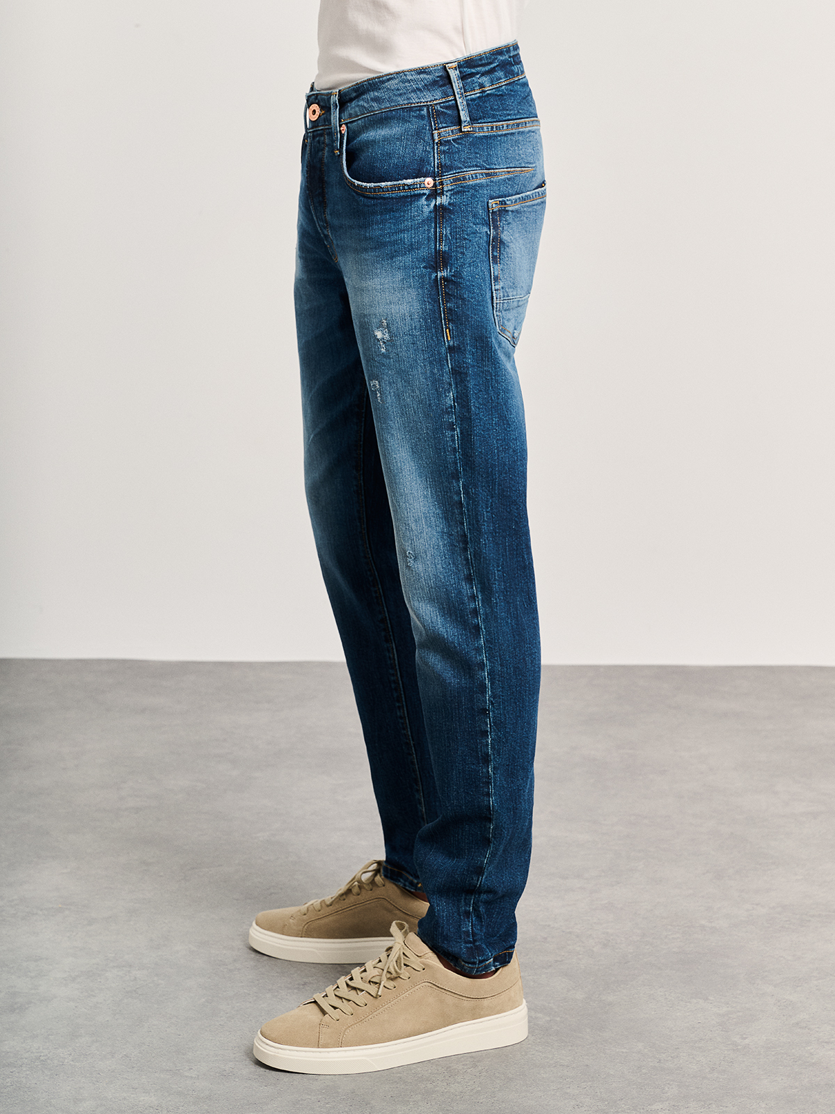 - Simon ανδρικό τζιν παντελόνι σε στενή γραμμή με ελαφριές φθορές.