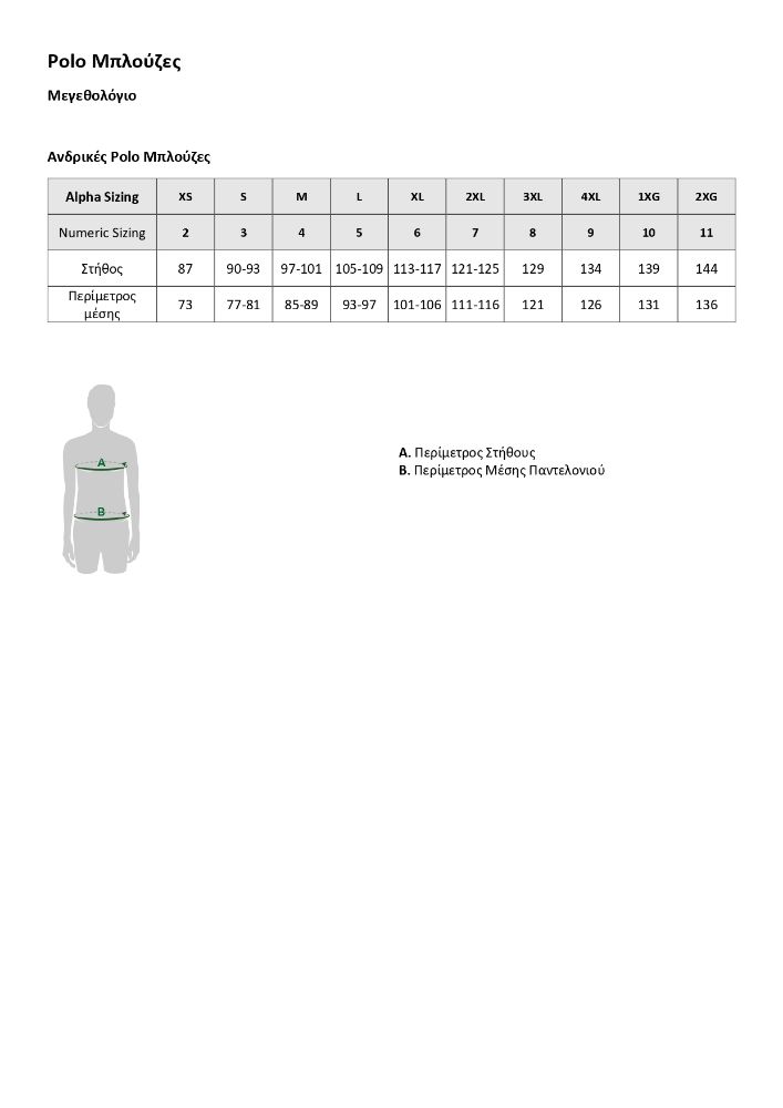Αυτό το μπλουζάκι πόλο ταιριάζει στο πραγματικό μέγεθος σας. Αν είστε μεταξύ δύο μεγεθών, σας προτείνουμε να αγοράσετε το μεγαλύτερο μέγεθος.