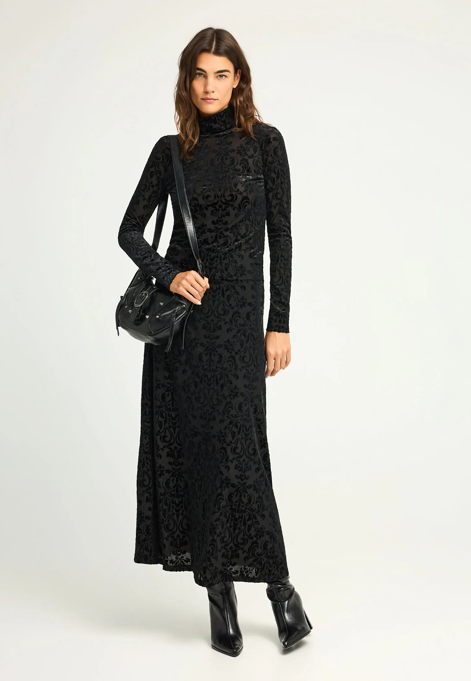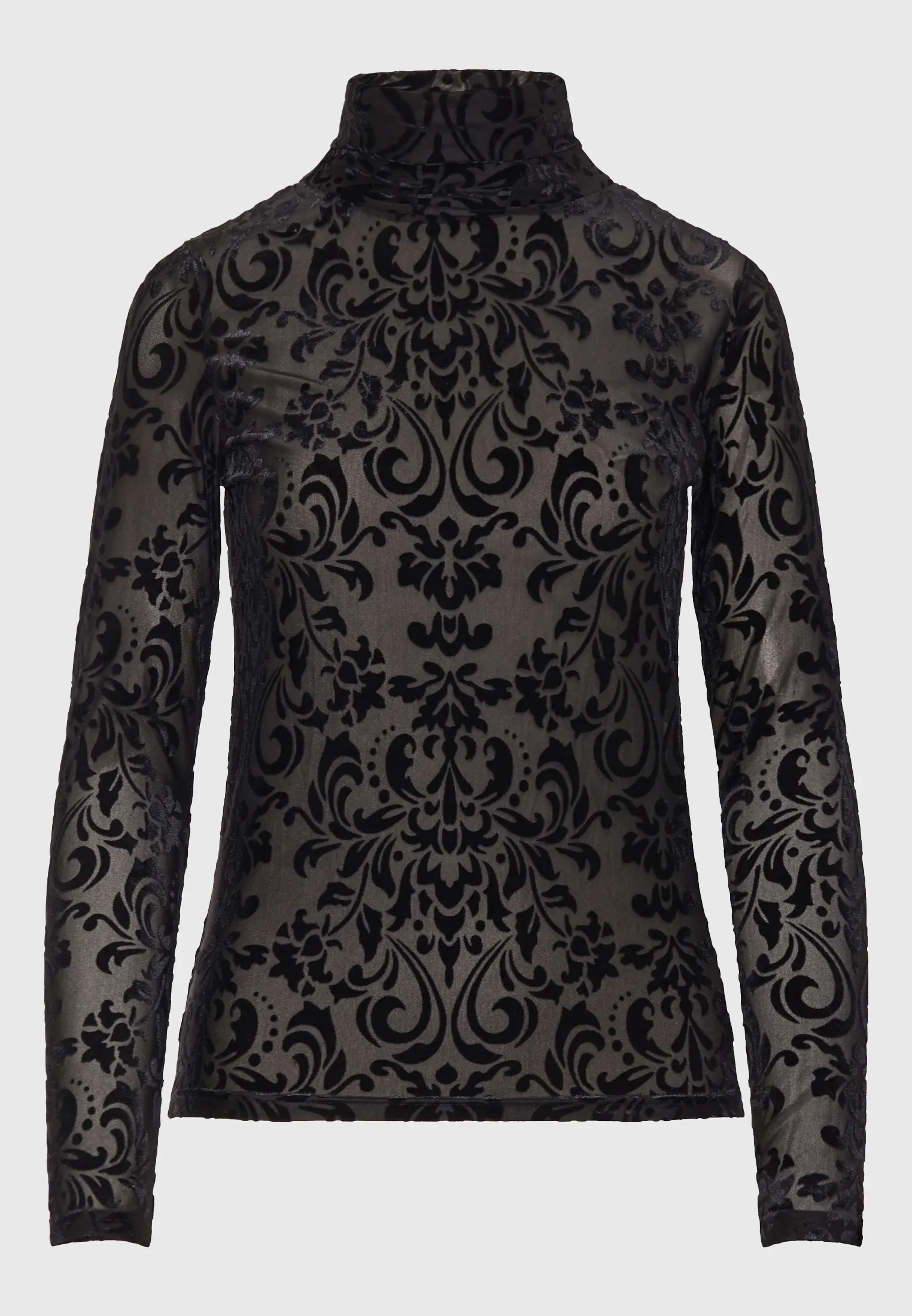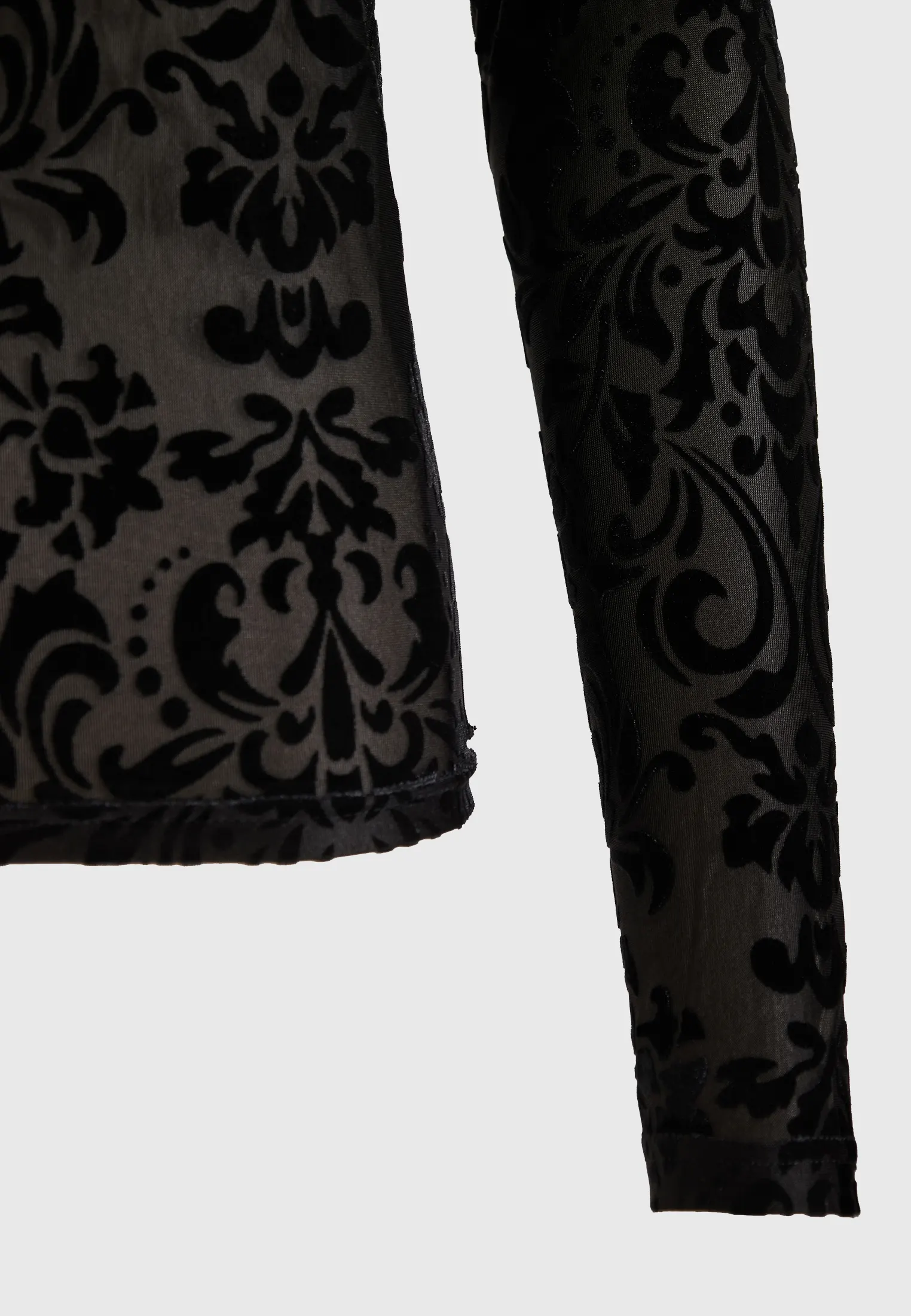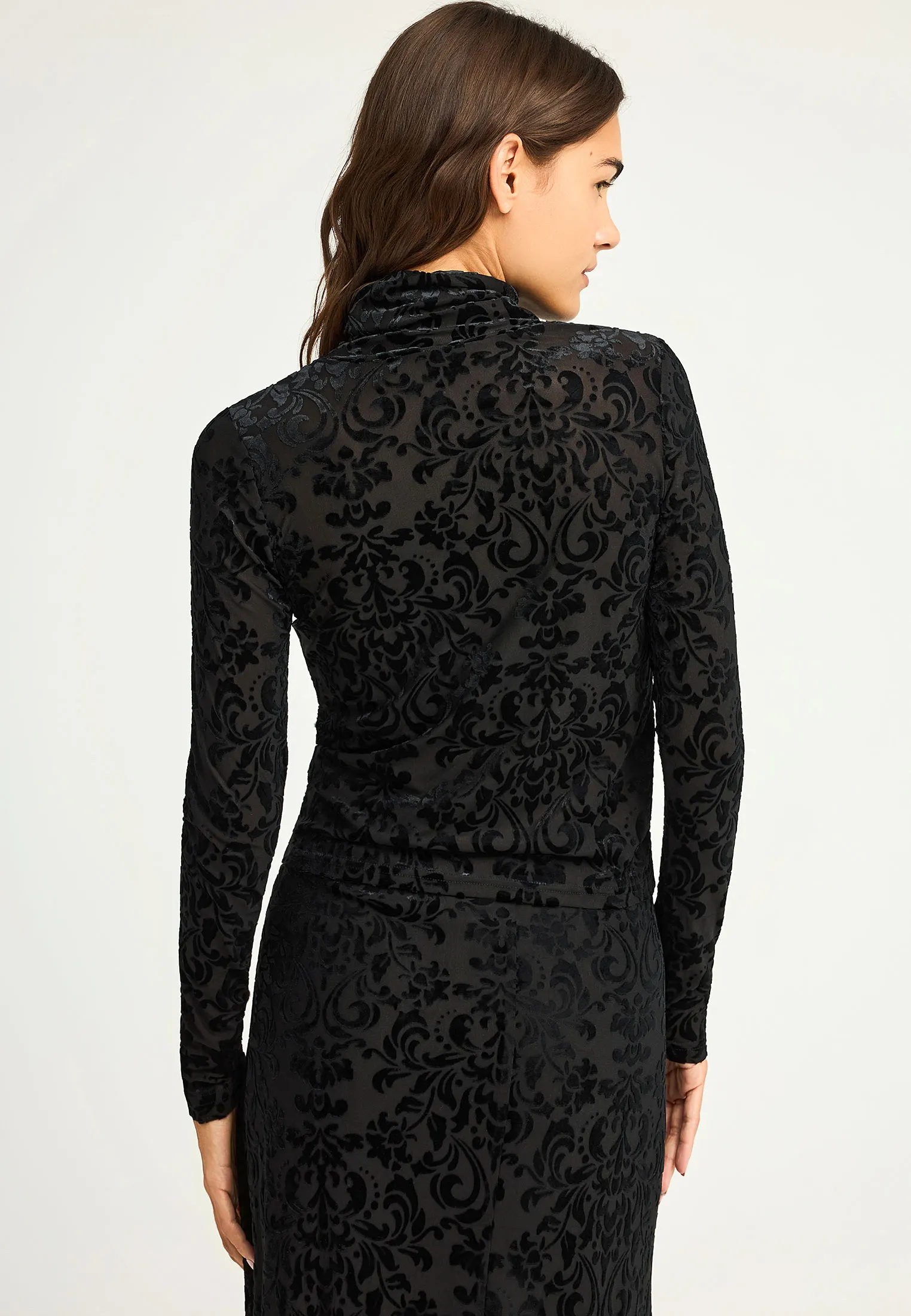 Αυτό το διάφανο τοπ με ψηλό λαιμό και μακριά μανίκια είναι ένα κομψό κομμάτι που η εφαρμοστή γραμμή του κολακεύει τη σιλουέτα, ενώ η ανάγλυφη υφή του το καθιστά ιδανικό για να προσθέσεις μια vintage και ρομαντική πινελιά στις βραδινές σου εμφανίσεις.