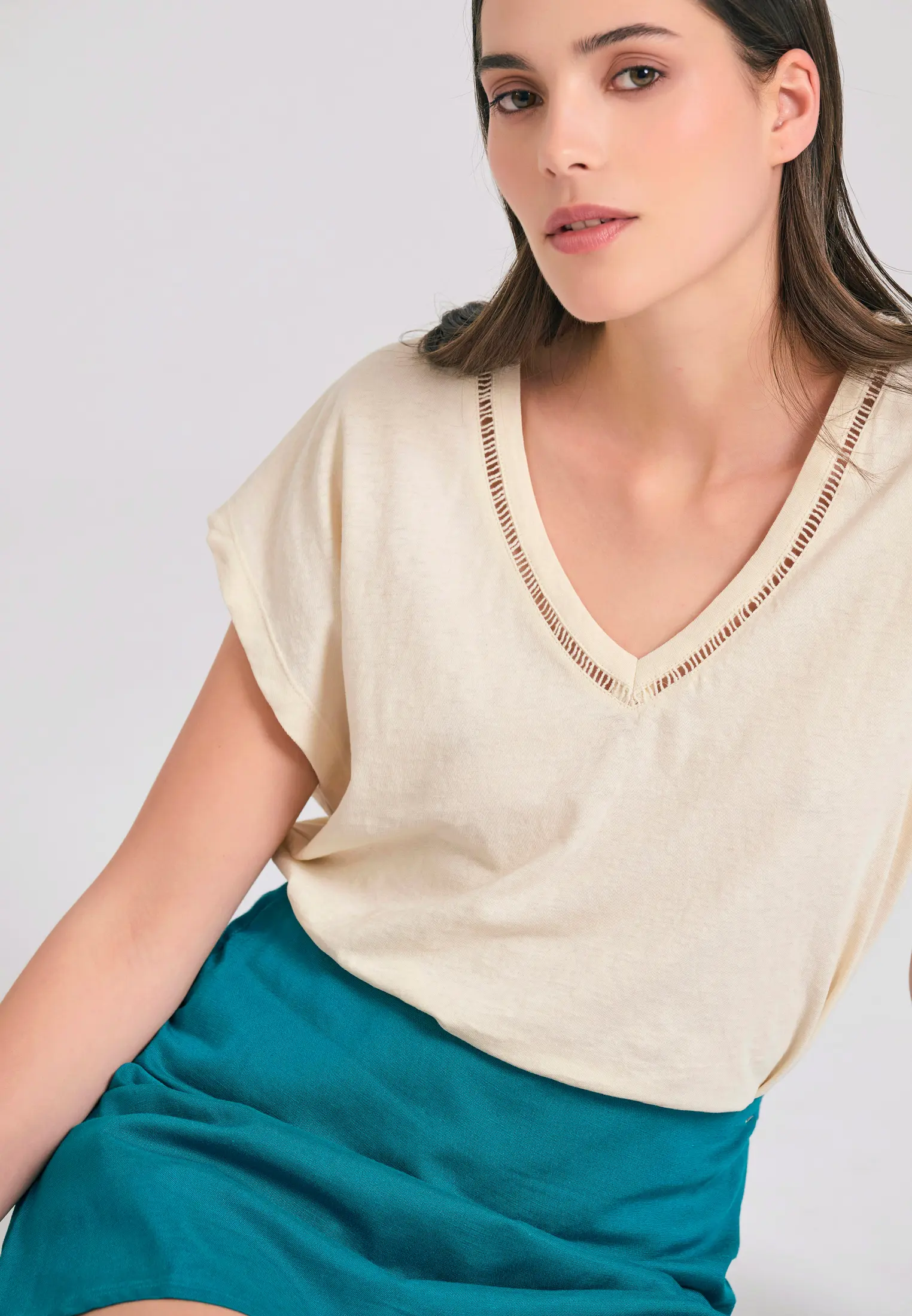 Αν θες κάτι χαλαρό αλλά καθόλου βαρετό, αυτό το τοπ θα γίνει το go-to κομμάτι σου. Με άνετη γραμμή και εντυπωσιακή V λαιμόκοψη που τραβάει διακριτικά τα βλέμματα, ταιριάζει πανεύκολα με ό,τι σκεφτείς – από φούστες μέχρι τζιν. Ιδανικό για all-day εμφανίσεις που συνδυάζουν ανεμελιά και στυλ.